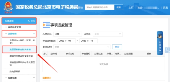 二、發(fā)票使用—發(fā)票申請(qǐng)—發(fā)票票種核定初次申請(qǐng),進(jìn)入票種申請(qǐng)模塊,在填寫并提交相關(guān)資料后,等待票種核定完成。