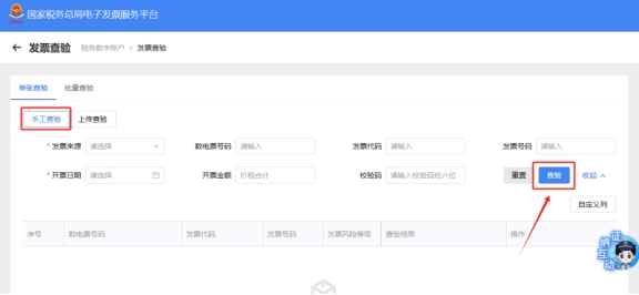 (1)使用電子發(fā)票服務平臺。納稅人可在電子發(fā)票服務平臺依次選擇【稅務數(shù)字賬戶】—【發(fā)票查驗】進入查詢界面,選擇“手工查驗”并按實際情況填寫相應項目,點擊“查驗”,系統(tǒng)會顯示對應發(fā)票查驗結果。