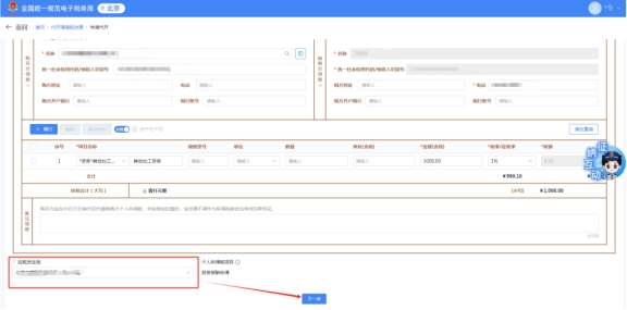 信息填寫(xiě)完,選擇應(yīng)稅發(fā)生地,然后點(diǎn)擊下一步。