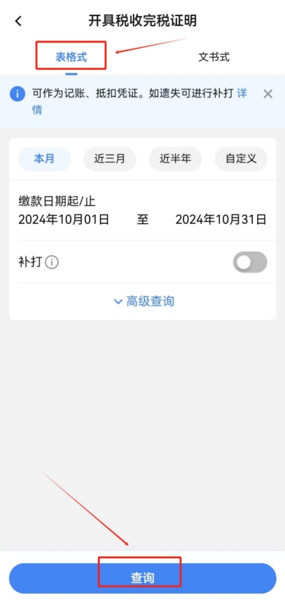 返回首頁(yè),點(diǎn)擊“開(kāi)具稅收完稅證明”,選中“表格式”后點(diǎn)擊下方“查詢(xún)”。