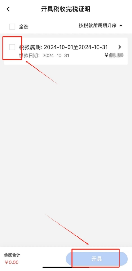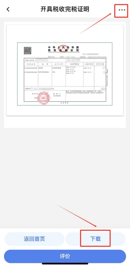 在查詢(xún)結(jié)果中勾選本次繳納的單筆稅款,點(diǎn)擊“開(kāi)具”,即可查看并下載完稅證明(如有需要,您可點(diǎn)擊完稅證明預(yù)覽頁(yè)面右上角“...”將發(fā)票分享至對(duì)方)。
