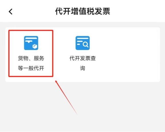 點(diǎn)擊“貨物、服務(wù)等一般代開(kāi)”(目前移動(dòng)端APP尚不支持房屋出租發(fā)票代開(kāi),如有需要您可通過(guò)電腦端線上辦理,具體操作步驟請(qǐng)查看個(gè)人代開(kāi)房屋發(fā)票,新電子稅局的操作流程來(lái)啦!)。