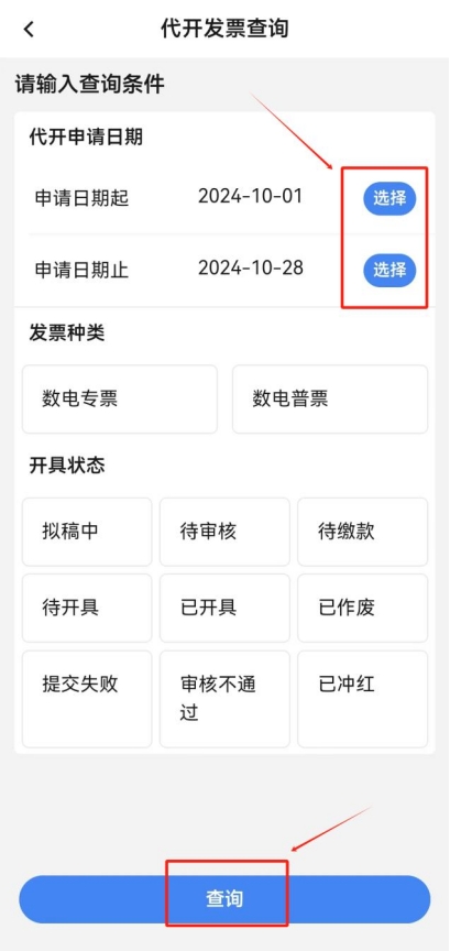 點(diǎn)擊首頁(yè)“代開(kāi)增值稅發(fā)票”,點(diǎn)擊“代開(kāi)發(fā)票信息查詢(xún)”,選擇提交申請(qǐng)的起止日期,點(diǎn)擊頁(yè)面下方的“查詢(xún)”。