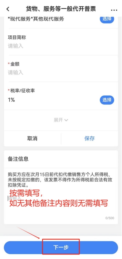 點(diǎn)擊“項(xiàng)目信息”一欄中的“添加項(xiàng)目信息”,“項(xiàng)目編號(hào)名稱(chēng)”選擇“*現(xiàn)代服務(wù)*其他現(xiàn)代服務(wù)”,“項(xiàng)目簡(jiǎn)稱(chēng)”按需據(jù)實(shí)填寫(xiě)(例如:勞務(wù)費(fèi)/講課費(fèi)等),“金額”據(jù)實(shí)填寫(xiě)開(kāi)票金額,“稅率/征收率”選擇“1%”,點(diǎn)擊“展開(kāi)”可填寫(xiě)更多信息,可根據(jù)開(kāi)票需求自行選擇填寫(xiě)(非必填項(xiàng)),填寫(xiě)完成后點(diǎn)擊“保存”。