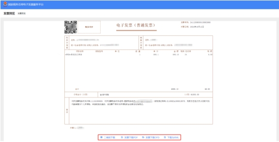 開(kāi)具成功后,可以點(diǎn)擊下載,可以二維碼下載,PDF下載,OFD下載,下載為XML等形式。