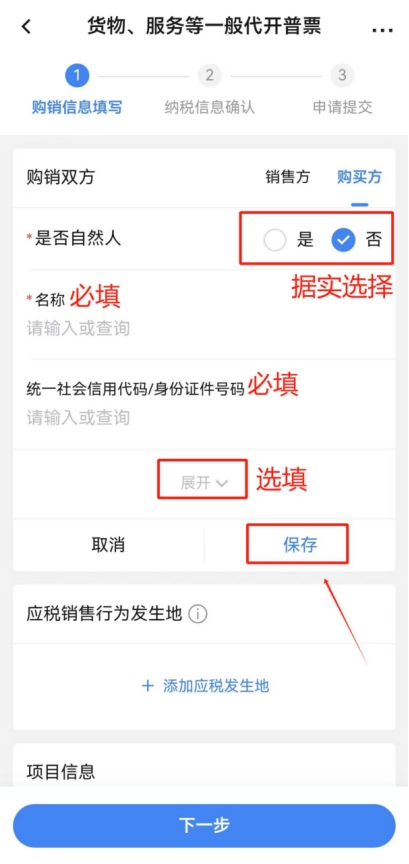 點(diǎn)擊“購(gòu)銷(xiāo)雙方”一欄中的“銷(xiāo)售方”,核驗(yàn)個(gè)人身份信息是否正確(銷(xiāo)售方僅能為登錄APP的用戶(hù)本人),無(wú)誤后點(diǎn)擊“購(gòu)買(mǎi)方”,點(diǎn)擊“添加購(gòu)買(mǎi)方”,根據(jù)實(shí)際情況選擇“是否為自然人”并填寫(xiě)“名稱(chēng)”及“統(tǒng)一社會(huì)信用代碼/身份證件號(hào)碼”(點(diǎn)擊“展開(kāi)”可填寫(xiě)更多信息,可根據(jù)開(kāi)票需求自行選擇填寫(xiě),非必填項(xiàng)),填寫(xiě)完成后點(diǎn)擊“保存”。
