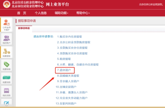 點(diǎn)擊頁(yè)面左側(cè)【我要提取-提取住房公積金-提取申請(qǐng)】,在新事項(xiàng)申請(qǐng)列表中點(diǎn)擊【7.退休銷(xiāo)戶】,閱讀并勾選《個(gè)人信息核查授權(quán)、承諾書(shū)》后進(jìn)入事項(xiàng)申請(qǐng)頁(yè)面,在“基本信息”欄目下系統(tǒng)自動(dòng)反顯用戶基本信息。住房公積金繳存人未達(dá)到男年滿60周歲、女年滿55周歲,或退休狀態(tài)未通過(guò)北京市社保養(yǎng)老部門(mén)核驗(yàn)的,還需提供相關(guān)退休材料,并點(diǎn)擊右側(cè)“上傳相關(guān)退休材料”。