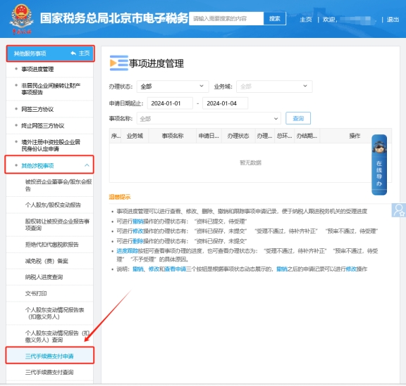 二、其他服務(wù)事項(xiàng)—其他涉稅事項(xiàng)—三代手續(xù)費(fèi)支付申請(qǐng)。
