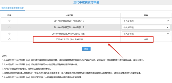 三、三代手續(xù)費(fèi)支付申請(qǐng)頁面,進(jìn)入后選擇2019年2月2日(含)及其以后點(diǎn)擊確定按鈕,進(jìn)入下一步,選擇開戶銀行、銀行賬號(hào)、填寫經(jīng)辦人及聯(lián)系電話,檢查帶出的信息(稅款類型、稅種、稅款所屬期、入庫金額、支付比例、手續(xù)費(fèi)金額)是否正確,確認(rèn)無誤后點(diǎn)擊提交申請(qǐng)按鈕即可。