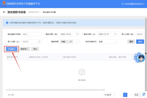三、海關繳款書采集頁面,點擊【手動錄入】錄入海關繳款書信息,點擊“確定”成功后,稍后可在查詢界面根據(jù)需要輸入或選擇相關查詢條件,然后點擊“查詢”按鈕,在結(jié)果展示區(qū)顯示符合查詢條件的海關繳款書。