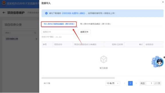 四、項(xiàng)目信息維護(hù)中對開具的項(xiàng)目信息進(jìn)行維護(hù),或在導(dǎo)入模板中填寫“商品與服務(wù)稅收分類編碼”。如未做項(xiàng)目信息維護(hù)且未填商品編碼,導(dǎo)入會不成功。