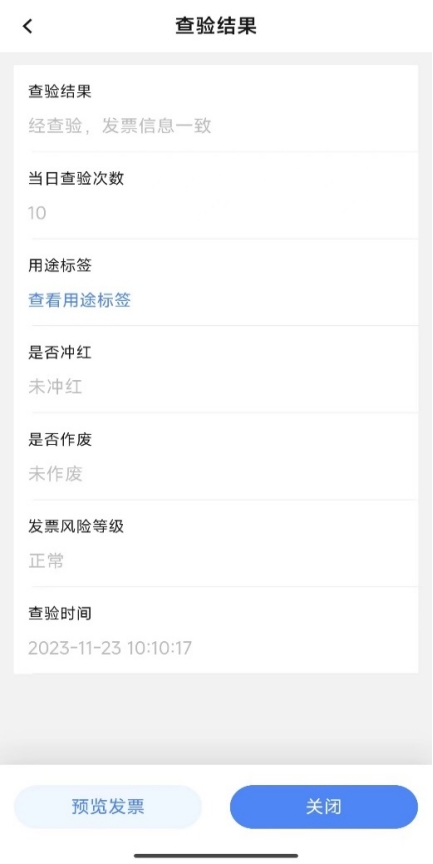 查驗本人發(fā)票,且結(jié)果一致時,反饋查驗結(jié)果“經(jīng)查驗,發(fā)票信息一致”,同時展示發(fā)票票面信息、發(fā)票標(biāo)簽信息(包括發(fā)票用途標(biāo)簽及紅字發(fā)票標(biāo)簽等)及發(fā)票查驗時間等信息;點(diǎn)擊【預(yù)覽發(fā)票】可以預(yù)覽發(fā)票的票面。查詢結(jié)果不一致的,反饋結(jié)果“經(jīng)查驗,發(fā)票信息不一致”,查驗結(jié)果為不一致時不可預(yù)覽發(fā)票。若未查到該發(fā)票信息,反饋結(jié)果為“未查詢到該發(fā)票信息”。