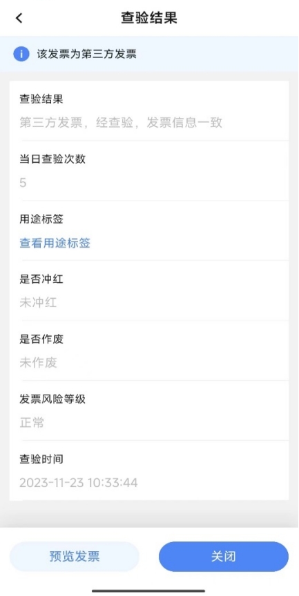 查驗第三方發(fā)票時,查驗結(jié)果一致的反饋提示“第三方發(fā)票,經(jīng)查驗,發(fā)票信息一致”,查驗結(jié)果一致時可點(diǎn)擊【預(yù)覽發(fā)票】查看發(fā)票票面信息;結(jié)果不一致的反饋提示“第三方發(fā)票,經(jīng)查驗,發(fā)票信息不一致”,查驗結(jié)果不一致時不可預(yù)覽發(fā)票;若未查到,系統(tǒng)反饋“第三方發(fā)票,未查詢到該發(fā)票信息”。