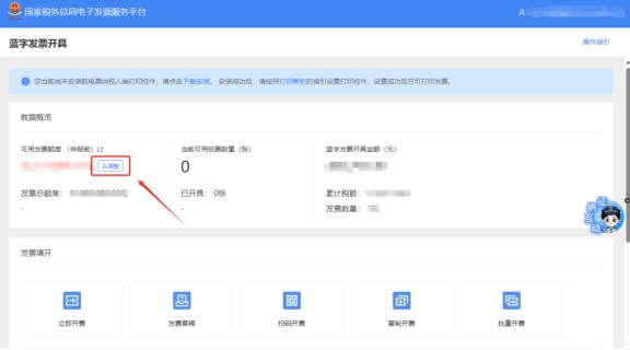 三、藍(lán)字發(fā)票開(kāi)具頁(yè)面,點(diǎn)擊“可用發(fā)票額度”旁【去調(diào)整】按鈕,進(jìn)入發(fā)票額度調(diào)整申請(qǐng)界面。