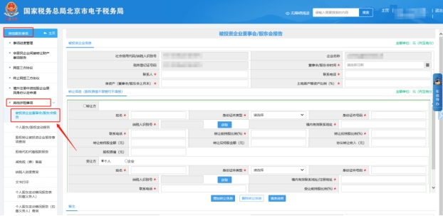 首先被投資企業(yè)登錄北京市電子稅務(wù)局備案(填寫兩張表)路徑:請(qǐng)您點(diǎn)擊【我要辦稅】—【其他服務(wù)事項(xiàng)】—【其他涉稅事項(xiàng)】—【被投資企業(yè)董事會(huì)/股東會(huì)報(bào)告和個(gè)人股東/股權(quán)變動(dòng)報(bào)告】;