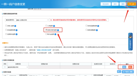三、一照一碼戶登記信息變更頁面,在此界面勾選“投資方相關(guān)信息”系統(tǒng)會(huì)帶出變更項(xiàng)目,請(qǐng)您自行增加或刪除修改,完成后點(diǎn)右上角下一步提交即可。