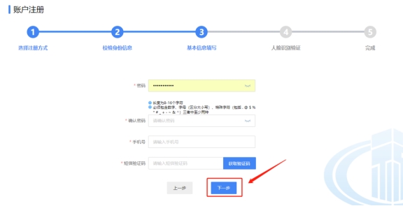 四、基本信息填寫可自行設(shè)置密碼,密碼設(shè)置要求長(zhǎng)度為8-16個(gè)字符且必須包含數(shù)字、字母(區(qū)分大小寫)、特殊字符(包括.@$% *#_+-&^)三者中至少兩種,填寫手機(jī)號(hào),點(diǎn)擊“獲取驗(yàn)證碼”。查收手機(jī)短信,填寫短信驗(yàn)證碼,點(diǎn)擊下一步;進(jìn)行人臉識(shí)別驗(yàn)證。