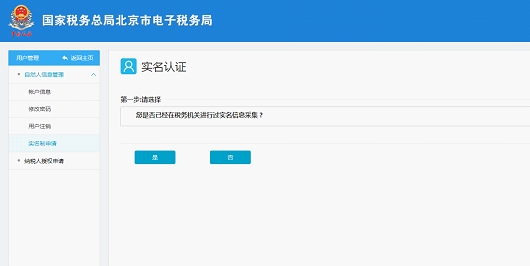 7.? 納稅人點(diǎn)擊“確定”按鈕后,進(jìn)入實(shí)名認(rèn)證界面,出現(xiàn)選擇提示“您是否已經(jīng)在稅務(wù)機(jī)關(guān)進(jìn)行過實(shí)名信息采集”,點(diǎn)擊“是”進(jìn)入關(guān)聯(lián)實(shí)名信息界面;點(diǎn)擊“否”進(jìn)入立思辰人臉識(shí)別驗(yàn)證界面;