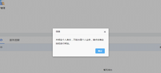 6.? 系統(tǒng)首先彈出“未綁定個(gè)人身份,不能辦理個(gè)人業(yè)務(wù)”的提示信息。納稅人可點(diǎn)擊“確定”按鈕。