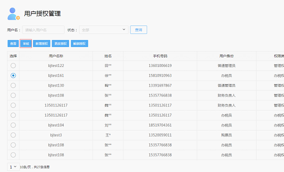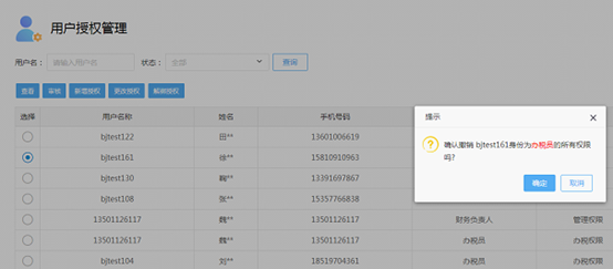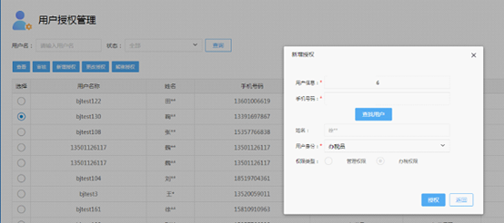 11.????? 企業(yè)授權(quán):納稅人還可進(jìn)行新增授權(quán)操作,輸入用戶信息和手機(jī)號(hào)碼,查詢出需要授權(quán)的相關(guān)用戶,選擇用戶身份,點(diǎn)擊授權(quán)即可。