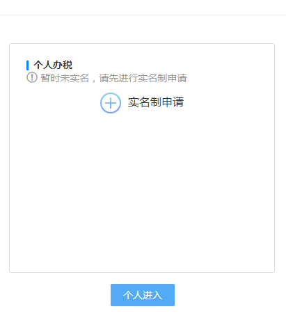 5.? 納稅人進(jìn)入實(shí)名申請(qǐng)界面,首先進(jìn)行個(gè)人辦稅實(shí)名申請(qǐng),點(diǎn)擊“個(gè)人進(jìn)入或?qū)嵜粕暾?qǐng)”按鈕。