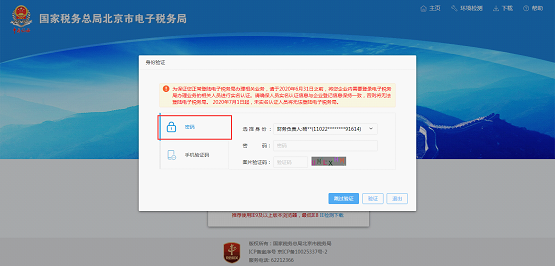1.? 選擇密碼方式登錄,選擇需要登錄電子稅務(wù)局的人員身份,輸入密碼(密碼為電子稅務(wù)局個(gè)人賬號(hào)登錄密碼)、圖片驗(yàn)證碼,點(diǎn)擊“驗(yàn)證”按鈕,即可進(jìn)入電子稅務(wù)局首頁(yè)界面;