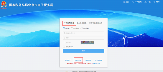 1.? 納稅人進(jìn)入北京市電子稅務(wù)局系統(tǒng),點(diǎn)擊“用戶注冊(cè)”按鈕,進(jìn)行用戶注冊(cè);