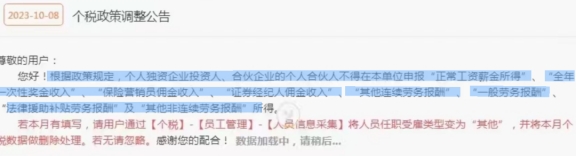 除了上文說到的個(gè)人所得稅不能長期零申報(bào)外,還有人收到了個(gè)稅調(diào)整公告:“根據(jù)政策規(guī)定,個(gè)人獨(dú)資企業(yè)投資人、合伙企業(yè)的個(gè)人合伙人不得在本單位申報(bào)"正常工資薪金所得”、"全次性獎(jiǎng)金收入”“保險(xiǎn)營銷員傭金收入”“證券經(jīng)紀(jì)人傭金收入”、“其他連續(xù)勞務(wù)報(bào)酬”、“一般勞務(wù)報(bào)酬”法律援助補(bǔ)貼勞務(wù)報(bào)酬”及“其他非連續(xù)勞務(wù)報(bào)酬”所得。