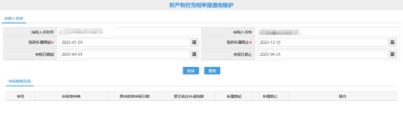 四、財(cái)產(chǎn)和行為稅申報(bào)查詢維護(hù)頁面,調(diào)整稅款所屬期、申報(bào)日期,點(diǎn)擊【查詢】,查到后點(diǎn)擊后方操作欄【作廢】菜單進(jìn)行作廢。