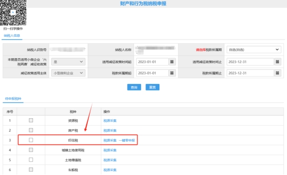 三、進(jìn)入“財產(chǎn)和行為稅納稅申報稅源采集”模塊后,點(diǎn)擊“印花稅”后方【稅源采集】。