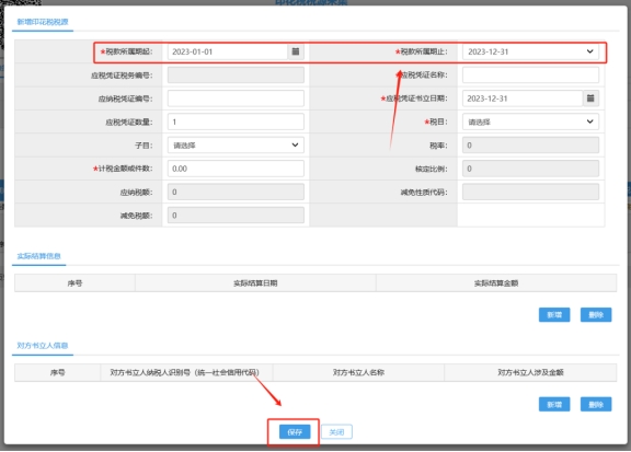 【財產(chǎn)和行為稅合并申報】界面點(diǎn)擊【填寫申報表】,選擇【財產(chǎn)和行為稅稅源采集】,進(jìn)入“財產(chǎn)和行為稅納稅申報稅源采集”模塊后,點(diǎn)擊“印花稅”后方【稅源采集】,進(jìn)入印花稅稅源采集界面,先點(diǎn)擊【按期申報】,再點(diǎn)擊右上角【新增按期申報稅源】,在此界面填寫稅源信息,其中稅款所屬期選擇2023年1月1日至2023年12月31日,帶*項(xiàng)為必填項(xiàng),需根據(jù)自身情況填寫相關(guān)數(shù)據(jù),必填信息全部填寫完成點(diǎn)擊【保存】,系統(tǒng)提示保存成功后點(diǎn)擊【確定】即可;