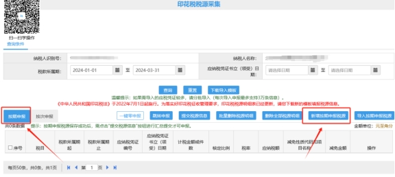 四、進(jìn)入印花稅稅源采集界面,先點(diǎn)擊【按期申報】,再點(diǎn)擊右上角【新增按期申報稅源】。
