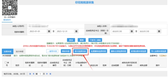 新增稅源信息保存成功后系統(tǒng)自動返回按期申報界面,根據(jù)查詢條件,選擇稅款所屬期2023年1月1日至2023年12月31日后點(diǎn)擊【查詢】,查到信息后勾選當(dāng)前需要申報的稅源信息后點(diǎn)擊右上【提交稅源信息】,提示提交稅源信息成功后點(diǎn)擊【確定】。