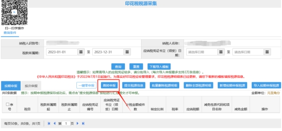 其他信息根據(jù)系統(tǒng)提示以及納稅人實(shí)際情況選擇后,勾選“印花稅”,點(diǎn)擊【申報】,系統(tǒng)自動帶出申報信息,核對無誤后再次點(diǎn)擊【申報】即可,如果信息有誤返回到稅源采集界面去更正稅源信息,然后再申報即可。