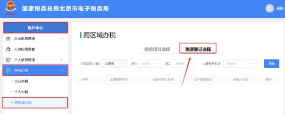 二、賬戶中心—身份切換—跨區(qū)域辦稅—稅源登記選擇,在此頁(yè)面選擇對(duì)應(yīng)的主管稅務(wù)機(jī)關(guān),點(diǎn)擊“切換”即可。