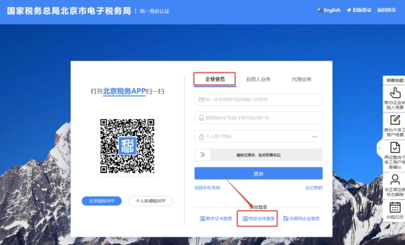 三、也可以通過(guò)電子稅務(wù)局新版登錄界面,選擇【企業(yè)業(yè)務(wù)】下方的“特定主體登錄”進(jìn)入電子稅務(wù)局,然后在主頁(yè)右上角點(diǎn)擊切換主管稅務(wù)機(jī)關(guān)。