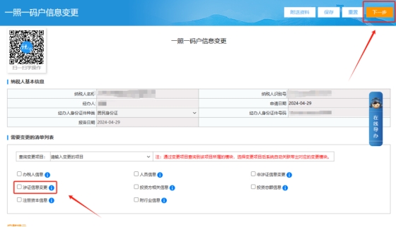 三、 一照一碼戶登記信息變更(或非一照一碼戶信息變更、兩證整合個體工商戶信息變更),勾選【涉證信息變更】查看是否帶出需要變更的項目,如帶出請在“變更后內(nèi)容”中核對帶出內(nèi)容無誤,點擊屏幕右上方【下一步】進(jìn)行提交,事項辦理完成則稅務(wù)登記變更成功。