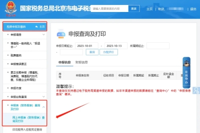 二、稅費(fèi)申報(bào)及繳納—申報(bào)表(財(cái)務(wù)報(bào)表)查詢及打印—網(wǎng)上申報(bào)表(財(cái)務(wù)報(bào)表)查詢及打印,財(cái)報(bào)信息(若需要打印財(cái)務(wù)報(bào)表請(qǐng)務(wù)必要選擇“財(cái)報(bào)信息”)—選擇申報(bào)日期起止點(diǎn)擊“查詢”即可。