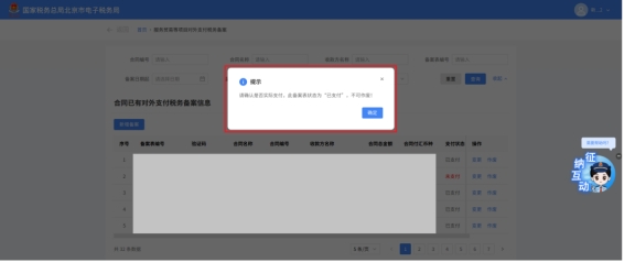 (3)當已備案記錄的支付狀態(tài)為“已支付”時,不允許作廢。點擊作廢備案信息時彈出提示“請確認是否實際支付,此備案表狀態(tài)為‘已支付’,不可作廢”。