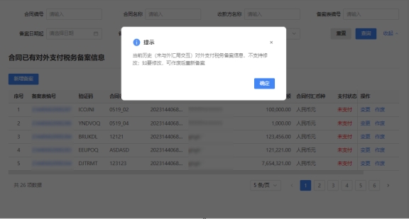 (3)對于已備案但無備案表編號的歷史備案數(shù)據(jù),不允許修改,只能作廢。點擊修改備案時彈出提示“當前歷史(未與外匯局交互)對外支付稅務備案信息,不支持修改;如要修改,可作廢后重新備案”。