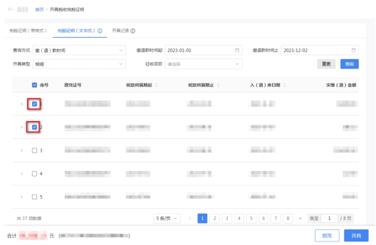 納稅人選擇好查詢條件后,點(diǎn)擊【查詢】,顯示可開具完稅證明的憑證信息,勾選需要開具完稅證明的憑證信息。納稅人可以選擇直接開具或預(yù)覽稅收完稅證明后開具。