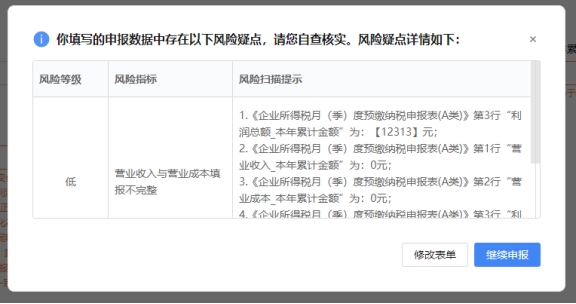 填報完成后,點(diǎn)擊“提交申報”按鈕,可以選擇“風(fēng)險提示服務(wù)”,則會將申報數(shù)據(jù)傳遞后臺進(jìn)行數(shù)據(jù)風(fēng)險比對,掃描比對未通過的,系統(tǒng)會將風(fēng)險事項(xiàng)進(jìn)行提示,納稅人可返回修改表單;