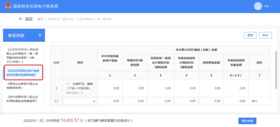 ②若納稅人需填報其他表單,如《資產(chǎn)加速折舊、攤銷(扣除)優(yōu)惠明細(xì)表》,則點(diǎn)擊左側(cè)報表列表進(jìn)行切換。