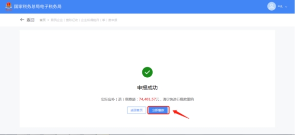 納稅人申報成功后,可以通過點(diǎn)擊“立即繳款”立即進(jìn)行稅款繳納,完成本次申報涉及的稅費(fèi)款繳納。