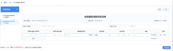 2)確認(rèn)數(shù)據(jù)是否正確,并進(jìn)行補(bǔ)充,點(diǎn)擊“編輯扣除項(xiàng)”可填寫《應(yīng)稅服務(wù)減除項(xiàng)目清單》。