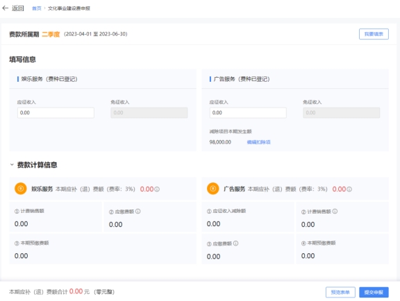 3)若繳費(fèi)人同時(shí)發(fā)生廣告業(yè)和娛樂業(yè)應(yīng)稅行為時(shí),可在申報(bào)頁面分別填報(bào)《文化事業(yè)建設(shè)費(fèi)申報(bào)表(娛樂服務(wù))》和《文化事業(yè)建設(shè)費(fèi)申報(bào)表(廣告服務(wù))》《應(yīng)稅服務(wù)減除項(xiàng)目清單(廣告服務(wù))》。