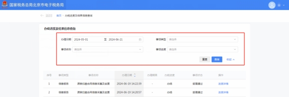 同時(shí),該模塊也可以看到最近通過新電子稅局辦理的業(yè)務(wù)事項(xiàng)。您可在上方搜索欄通過選擇“辦理日期”、“事項(xiàng)類型”、“事項(xiàng)名稱”、“事項(xiàng)進(jìn)度”點(diǎn)擊【查詢】搜索想要查詢的業(yè)務(wù)事項(xiàng),點(diǎn)擊【進(jìn)度詳情】,可查看詳細(xì)的辦理進(jìn)度。