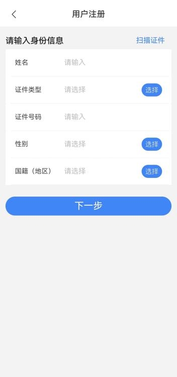 進(jìn)入身份信息采集頁(yè)面。身份信息采集可以通過(guò)手動(dòng)輸入姓名、證件類型、證件號(hào)碼、性別、國(guó)籍等信息或通過(guò)點(diǎn)擊右上角“掃描證件”,進(jìn)入證件掃描界面,按提示進(jìn)行證件掃描。