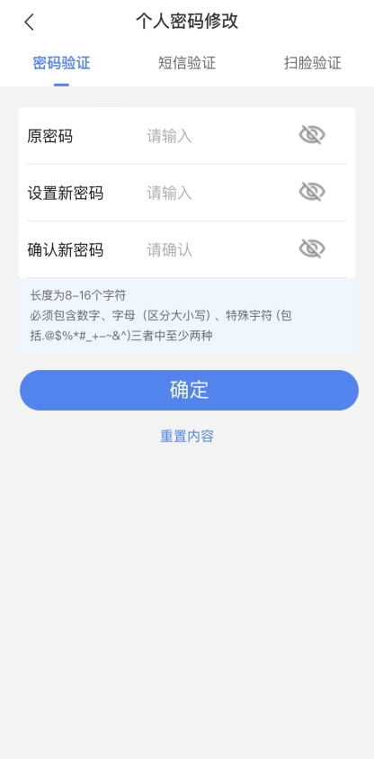 修改密碼有密碼驗(yàn)證、短信驗(yàn)證、掃臉驗(yàn)證三種驗(yàn)證方式,用戶可以任意選擇其中一種依據(jù)提示完成密碼修改。