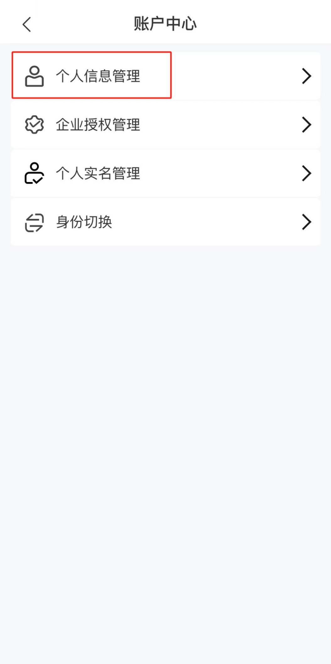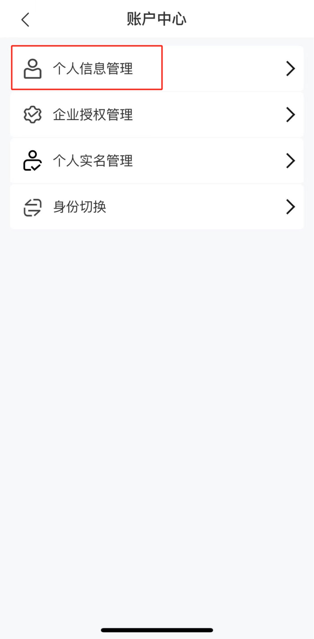 用戶以個(gè)人身份登錄或切換至個(gè)人身份后(切換操作詳見下文身份切換),進(jìn)入賬戶中心頁面。點(diǎn)擊選擇“人員信息管理”,可選擇查看當(dāng)前登錄的人員基本信息。